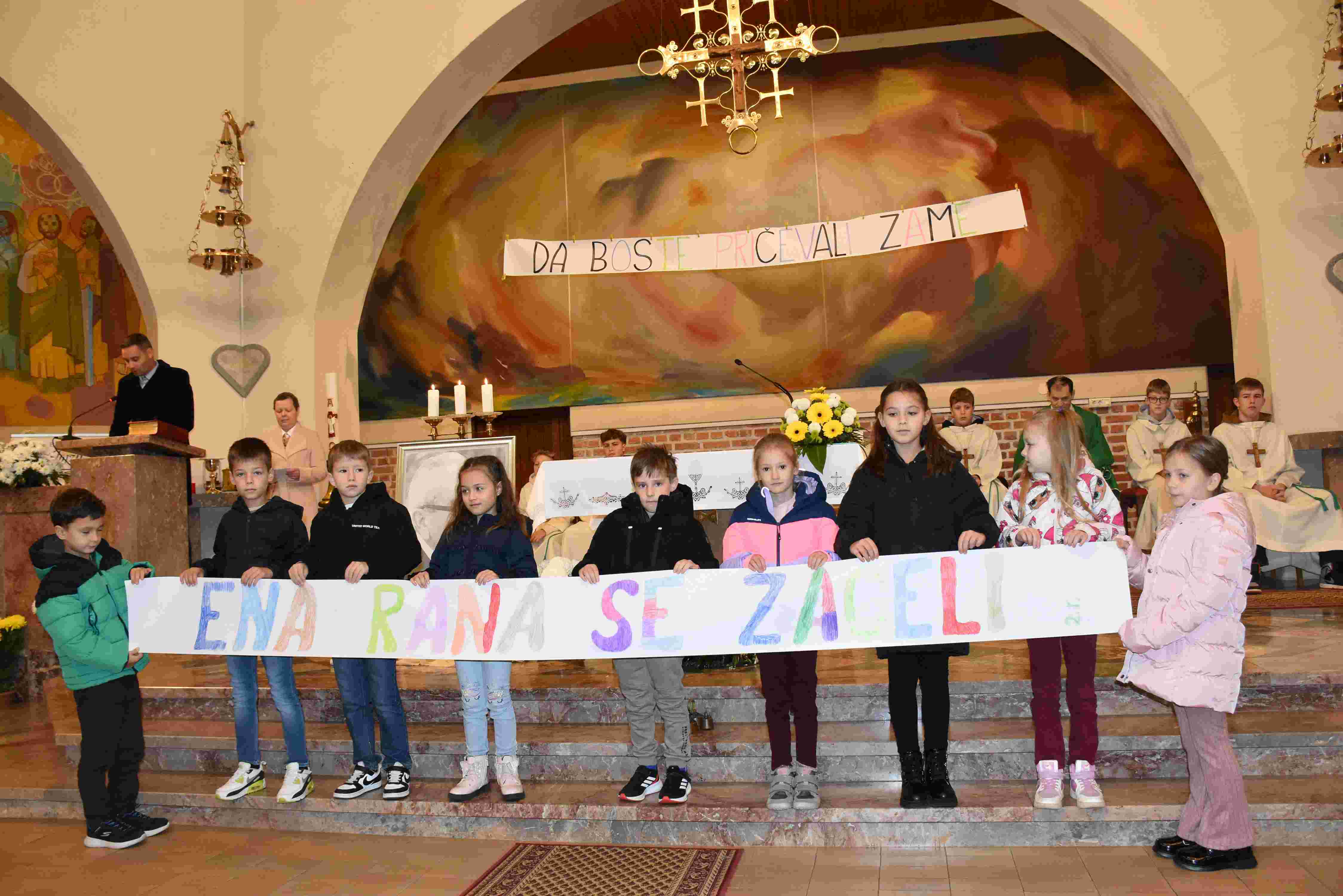 Obhajanje 115-obletnice rojstva in krsta Božjega služabnika Alojzija Kozarja (rojen je bil 11. novembra 1910 in krščen naslednji dan) se je začelo pri veroučnih urah v minulem tednu. Učenci posameznih razredov so se na kratko seznanili z vsebino knjige Neuničljivo upanje, v kateri je opisano, kako so za Kristusa pričevali Božji služabnik Alojzij Kozar in odranski verniki. Učenci so na trak zapisali po en naslov iz te knjige. Pri sveti maši, ki je bila ob 9. uri, so poleg zbora Neuničljivo upanje sodelovali godbeniki Srebrnega kvarteta iz Martinja, ki so zaigrali nekaj pesmi in tako obogatili bogoslužje. V drugem delu pridige so učenci posameznih razredov pred oltar prinesli trakove z naslovi, bralca pa sta prebrala kratko vsebino poglavja in zahvalno molitev za naše pričevalce. V evangeliju smo namreč slišali Jezusove besede o preganjanju njegovih učencev, ki se bo dogajalo zato, »da boste pričevali zame«. Ta misel je bila tudi izpisana nad oltarjem in je vse navzoče vabila, da bi vztrajali v veri in po zgledu Božjega služabnika Alojzija Kozarja in odranskih vernikov pričevali za Kristusa.